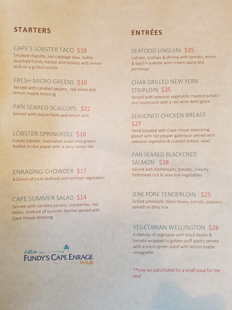 Welcome to Cape House Restaurant, nestled at 650 Cape Enrage Rd, Waterside, NB. This hidden gem offers a delightful menu that showcases the best of local flavors. Dive into their signature Cape House Burger or savor the Foggy Day Sandwich for a taste of comfort. Seafood lovers will be enchanted by the creamy seafood chowder, praised as the best by guests, while the Haddock fish shines, especially on warm summer days.